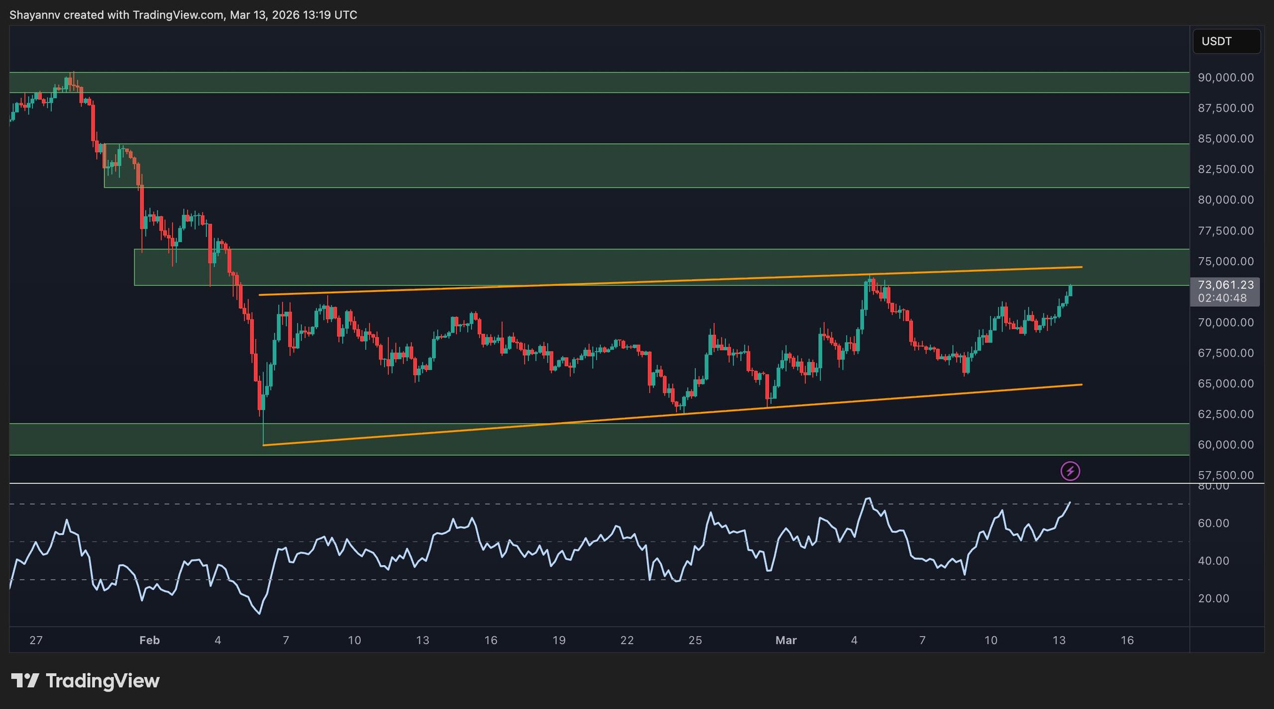 Momentum supports the idea of short-term strength, with RSI pushing into the upper end of its range. Still, that also means BTC is arriving at resistance with momentum already stretched. So the next move matters. A clean break above the channel top and the $73K to $75K supply band would suggest continuation toward the next overhead zones. A rejection here, on the other hand, would likely send the price back toward the mid-range and keep the market trapped in consolidation for longer.