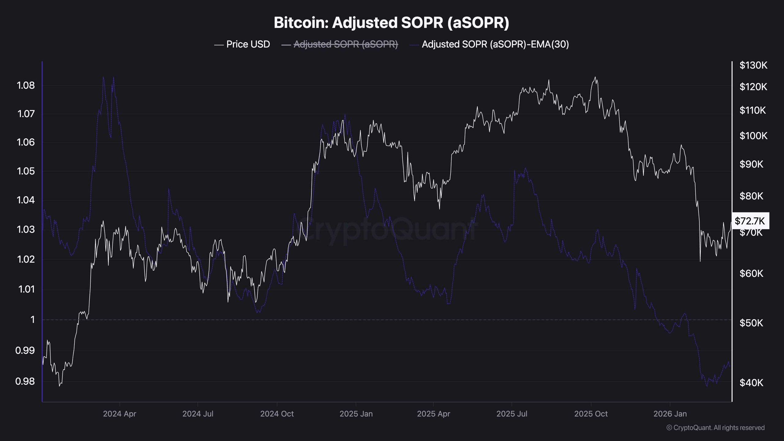 At the same time, aSOPR has started to rebound from its recent lows, which is an early sign of improving conditions. That does not confirm a new expansion phase on its own, but it does hint that the worst of the capitulation pressure may already be behind the market. Put differently, price is testing resistance while on-chain behavior is trying to heal. If those two start aligning through a confirmed breakout on the chart and a move back above 1 on aSOPR, Bitcoin’s outlook would become much stronger.
